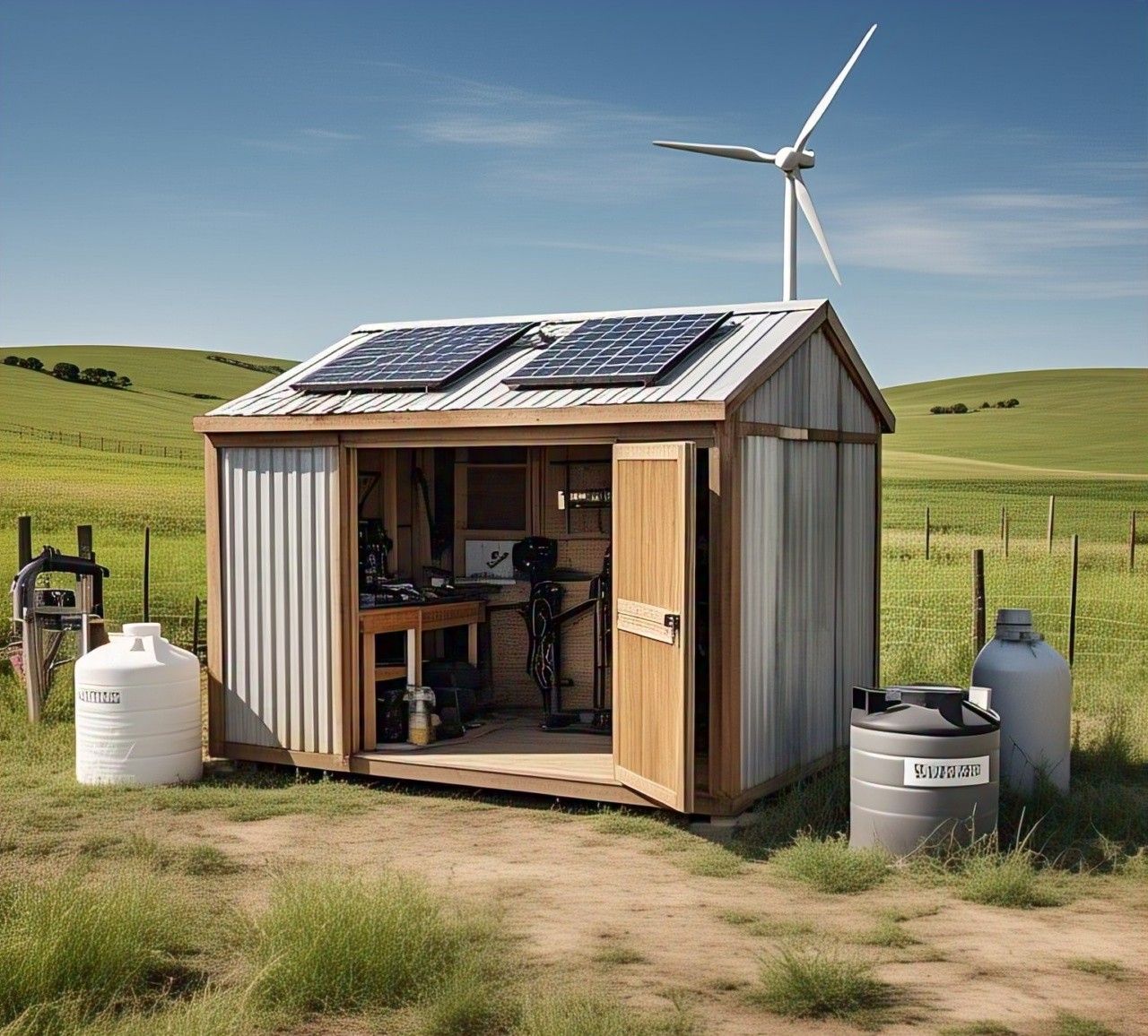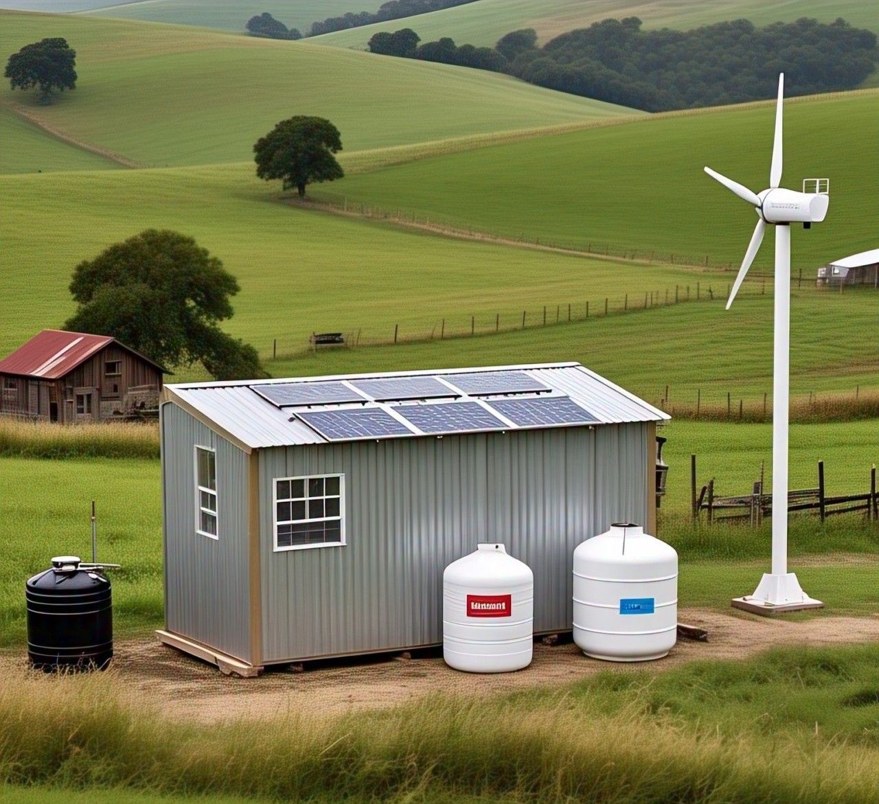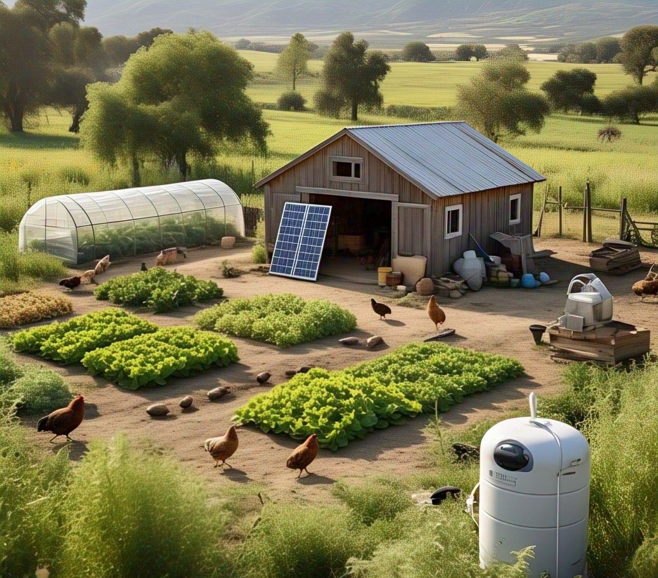 At the heart of the farm is the AquaVolt Home Oasis: a patented, battery-free energy system that produces water, power, and agricultural stability using the sun, wind, and hydrogen. It powers our lights, pumps, greenhouses, and even helps grow food more efficiently.